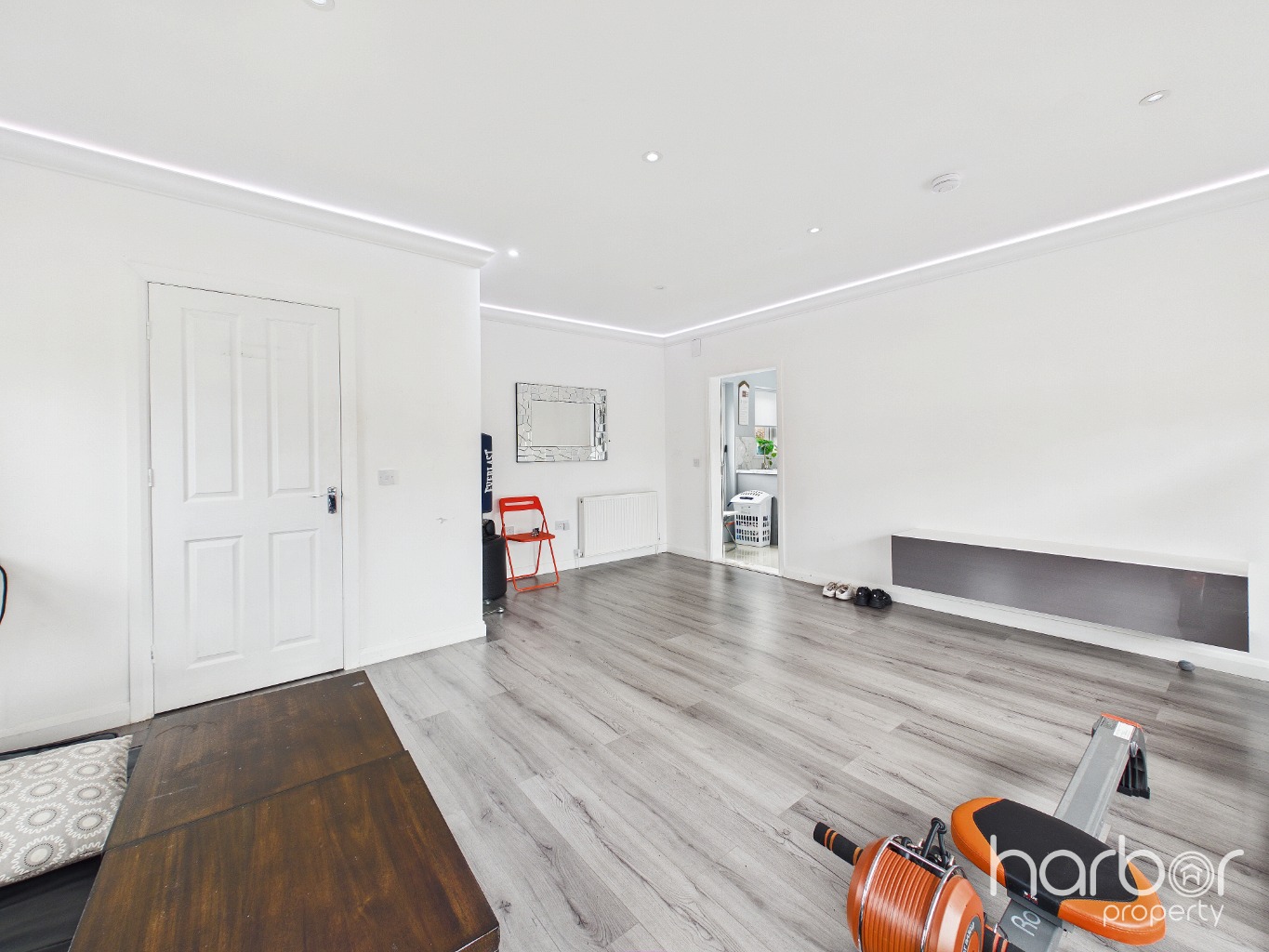 From the kitchen, there is convenient access to both the utility room and the study. The utility provides additional workspace and storage, and leads through to the converted double garage, currently used as a home gym. This substantial room offers excellent flexibility and could easily be adapted for a variety of uses such as a playroom, cinema room, studio, or additional family living space. The conversion also includes valuable additional storage.